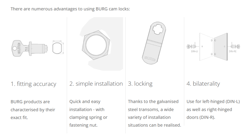 BURG also manufactures cam cylinders as special solutions for well-known industrial manufacturers, on request with customer logo, special bolt or individual surface.